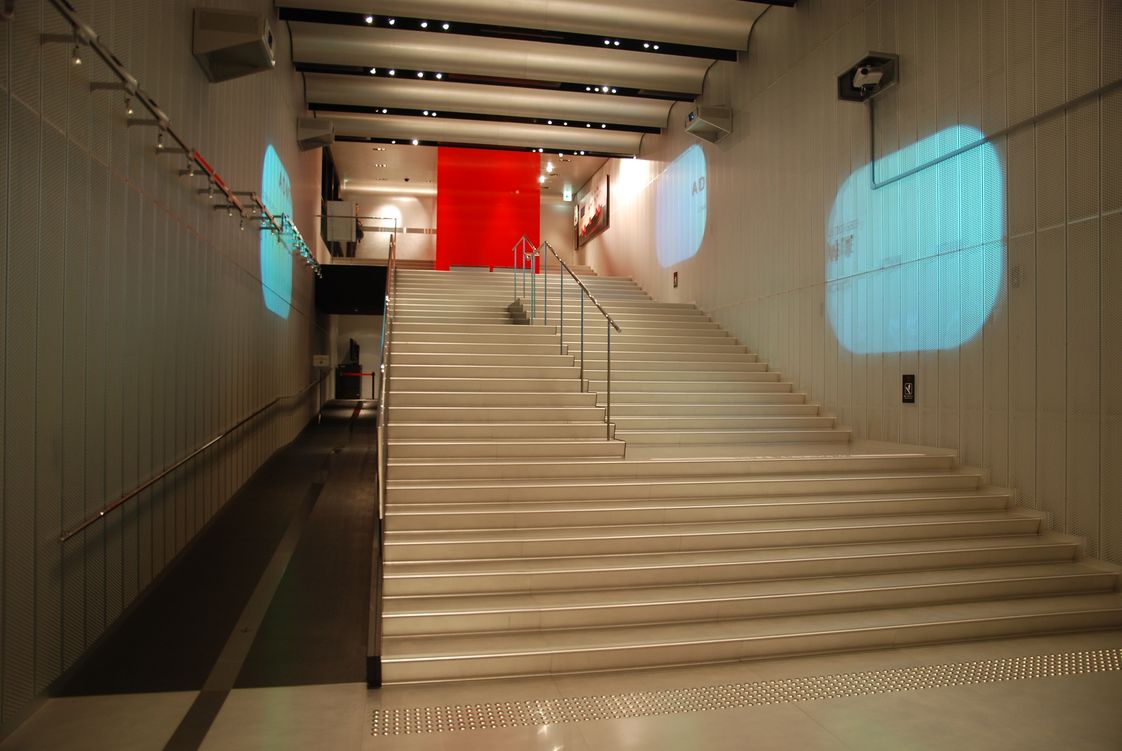 ความน่าสนใจของงานนี้อยู่ผมคิดว่าอยู่ตรงที่การนำวัสดุ perforated metal (แผ่นโลหะที่เจาะเป็นรูพรุนๆ) มาใช้เป็นวัสดุผนัง ตรงบริเวณ Grand Hall และส่วนนิทรรศการต่างๆ พอเวลาเขาฉายภาพโปรเจคเตอร์ลงไปบนวัสดุนี้ มันให้เอฟเฟคที่ดูน่าสนใจดีครับ