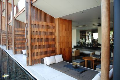 บริเวณทางเข้าหลักหน้าโรงแรม facade ด้านนี้เขาออกแบบให้เป็นไม้ซี่ถี่ๆเพื่อช่วยในเรื่อง privacy ของแขกที่มาพัก เพราะด้านนี้ติดกับถนนสาธารณะครับ